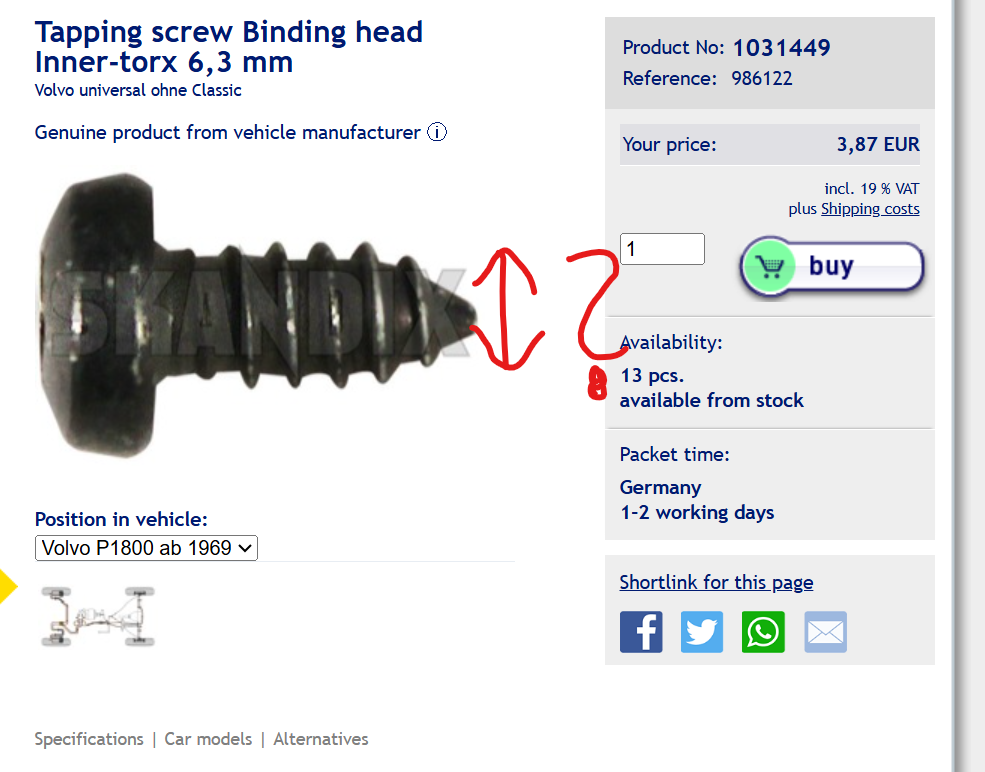 As I know so far, the OE-code of the screw is 986122. The exact length should be 13 mm and thread size 6,3 mm as I read from skandix.de. But I can't figure out or find information from anyhere about the diameter of screw's thread like is it a M6 screw, M4 screw or which? Or maybe can someone tell the size/diameter of the hole where this screw sits in.