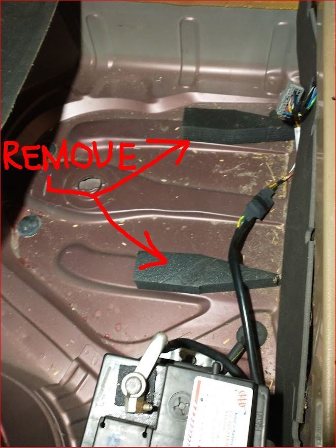 I removed one of the wheels to use to test if it will fit into the spare wheel well. I also peeled off the 2 black hard foam pads glued towards the backside of the wheel well. Carefully placed the regular wheel into the well. Takes a little wiggling around bit eventually drops in. I glued 1/2"x12"x20" bubble wrap where the hard foam was. Also popped both trunk floor boards to open up the top side. See pics: Remove foam pads I put bubble wrap. A thin flat hard foam would work too.