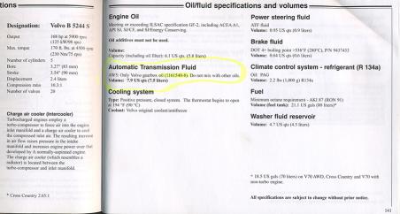 That is certainly an interesting position, but not one shared by all Volvo mechanics. After reading through the entire stickied S60 transmission fluid thread (yes, all 30 pages) I opted to do a drain/fill with Valvoline Maxlife Synthetic ATF because one of the listings for compatibility on the bottle was exactly the same as the spec listed in my owners manual for my AW trans. 2,500 miles later and the initial improvements in performance are still there and I am going to do another drain/fill in another 2,500 miles. I will report the results in that thread after it is done. Bottom line...make damn sure the fluid you use is compatible to your specific car, and there are multiple Volvo specs, so don't look for it to just say Volvo.