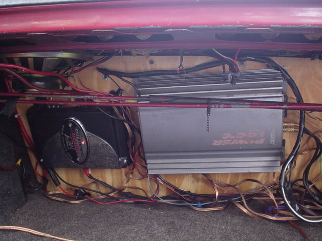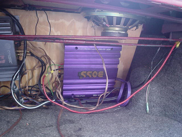 4 - 5.5" door speakers (who doesn't?) 2 - 6"x9" pioneer two ways 1 - 6"x8" pioneer three way center channel 2 - 10" MTX woofers 1 - 12" sony something or other woofer custom box for all three 1300 watt alpine amp for the 10's 2 - 240 watt california amps, one for the 6x9's and one for the 12 capasitor (i forget the output on it) Pyramid 10 band EQ DEH 8600 pioneer head unit. It was quite a frankenstein system...i had the 1300 amp and 10's on the sub woofer output while the 240 amp and 12" was on the rear channel RCA output. The other 240 watt and 6x9's were connected to the rear channel and all four 5.5"ers were on the front channel. The 6x8 center was a combination of the front right and left via a crossover i ganked from a friend of mine.....it blew out a month later so i guess it didn't really work. |
