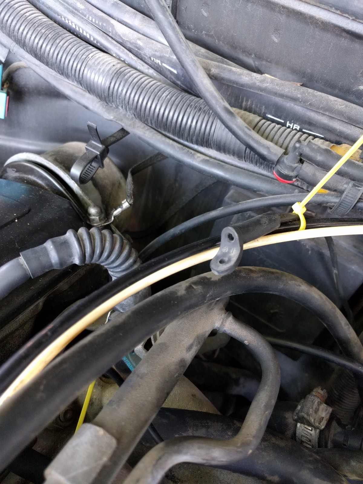 While I was going through the engine (B230f) I noticed a vacuum hose near the center of the engine bay against the firewall (photo attached, hose held with the yellow Zip Tie) that was not connected to anything and hissing badly. Guessing this is not as designed. Anyone know where this thing goes? I've looked all over for a vac diagram, or photo without success. I see nothing obvious within reach of the hose, nor do I see any other nipples or hoses that are not connected to anything.