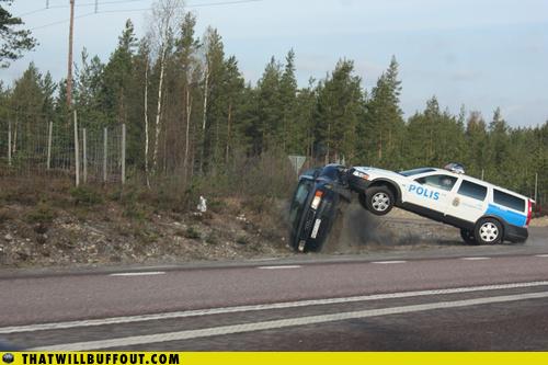 Swedish Police vehicle... that's an action shot- note the dust coming up under the Audi, the airbags still inflated in the Audi, and the driver in the Volvo. I want to know WTF happened!