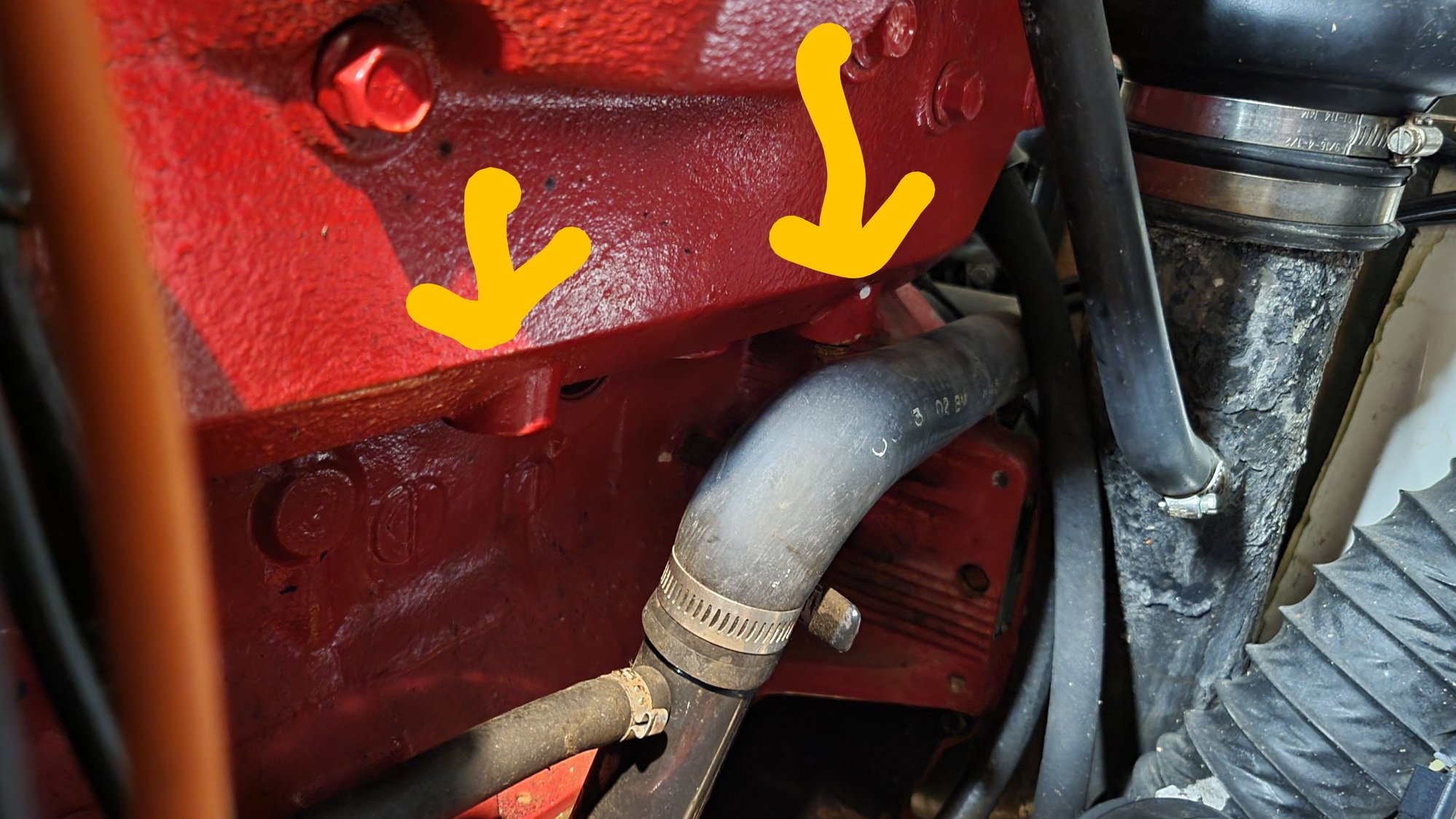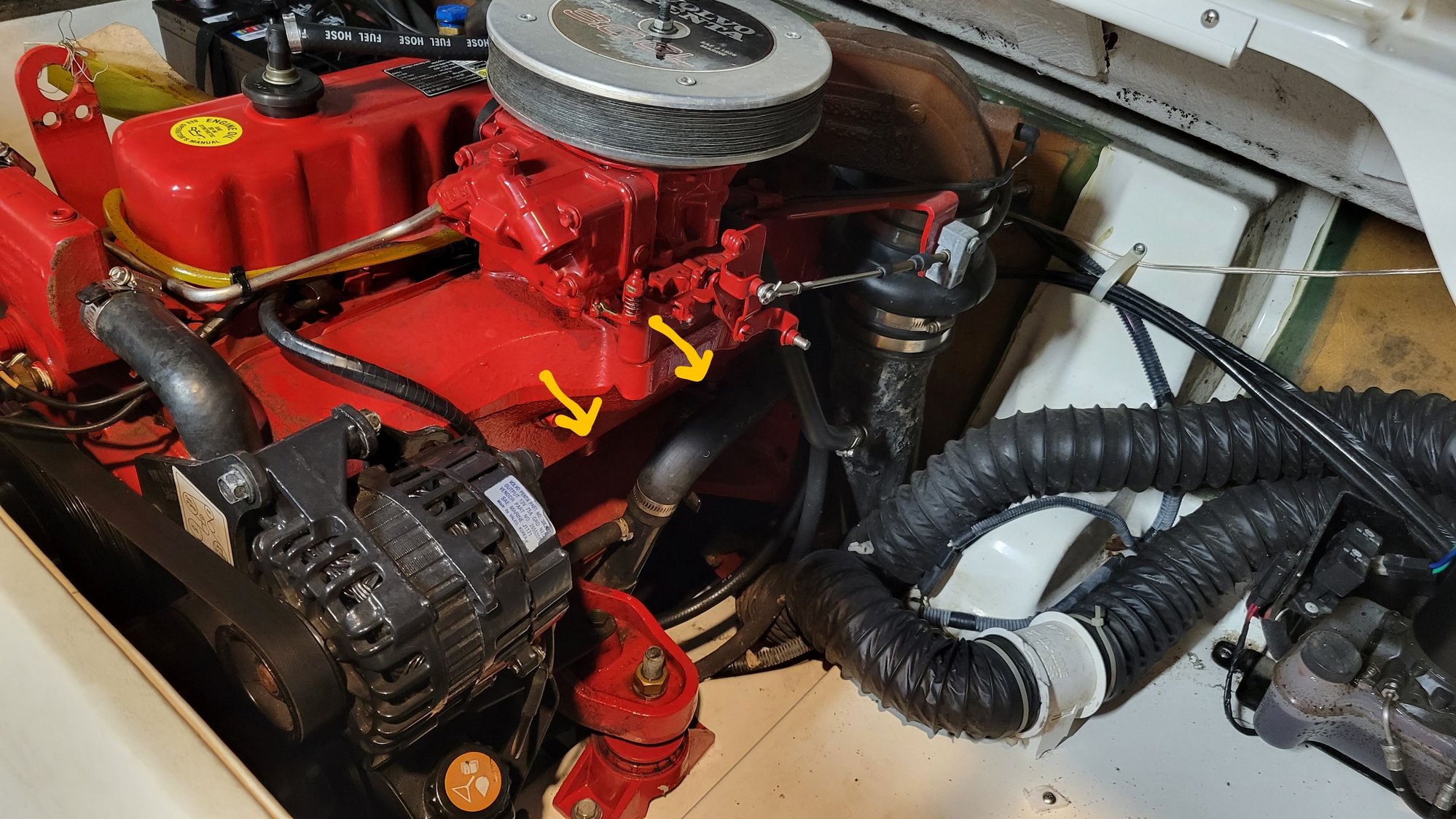While I was cleaning out the boat today, I noticed two cylindrical pieces that stick out of the engine block. One has a bolt in it, the other does not. The second one has a hole with threads but nothing was screwed into it.