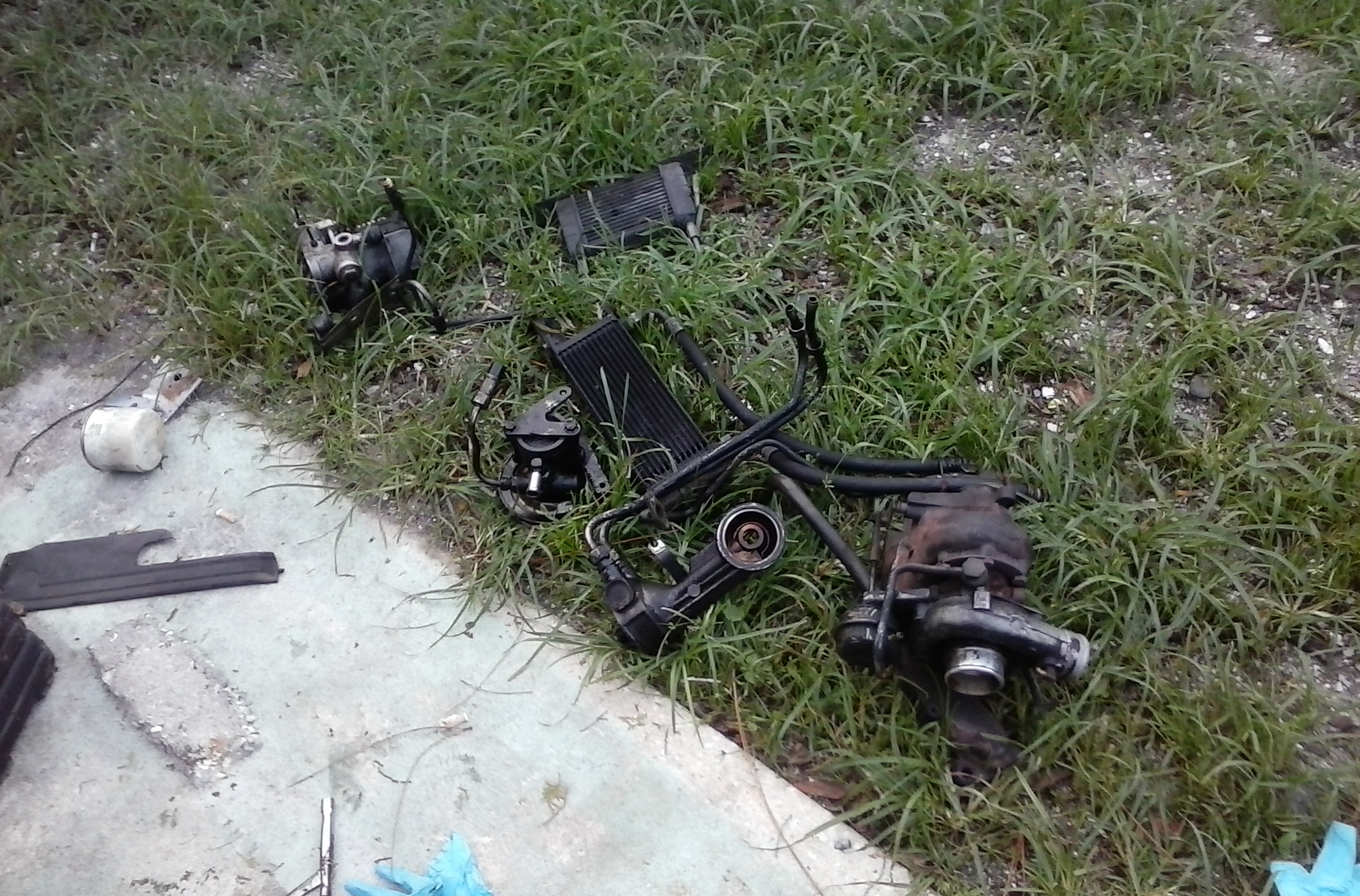 Oh Cwazywazy..... Got it all FINALLY! Except for the harness/ECU/ICU. EVERYTHING else is good to go. And the line from the bottom of the turbo to the block and one of the 2 top lines are completely intact! The one that I bent (not cut) didn't pinch and could easily be bent back to fit.