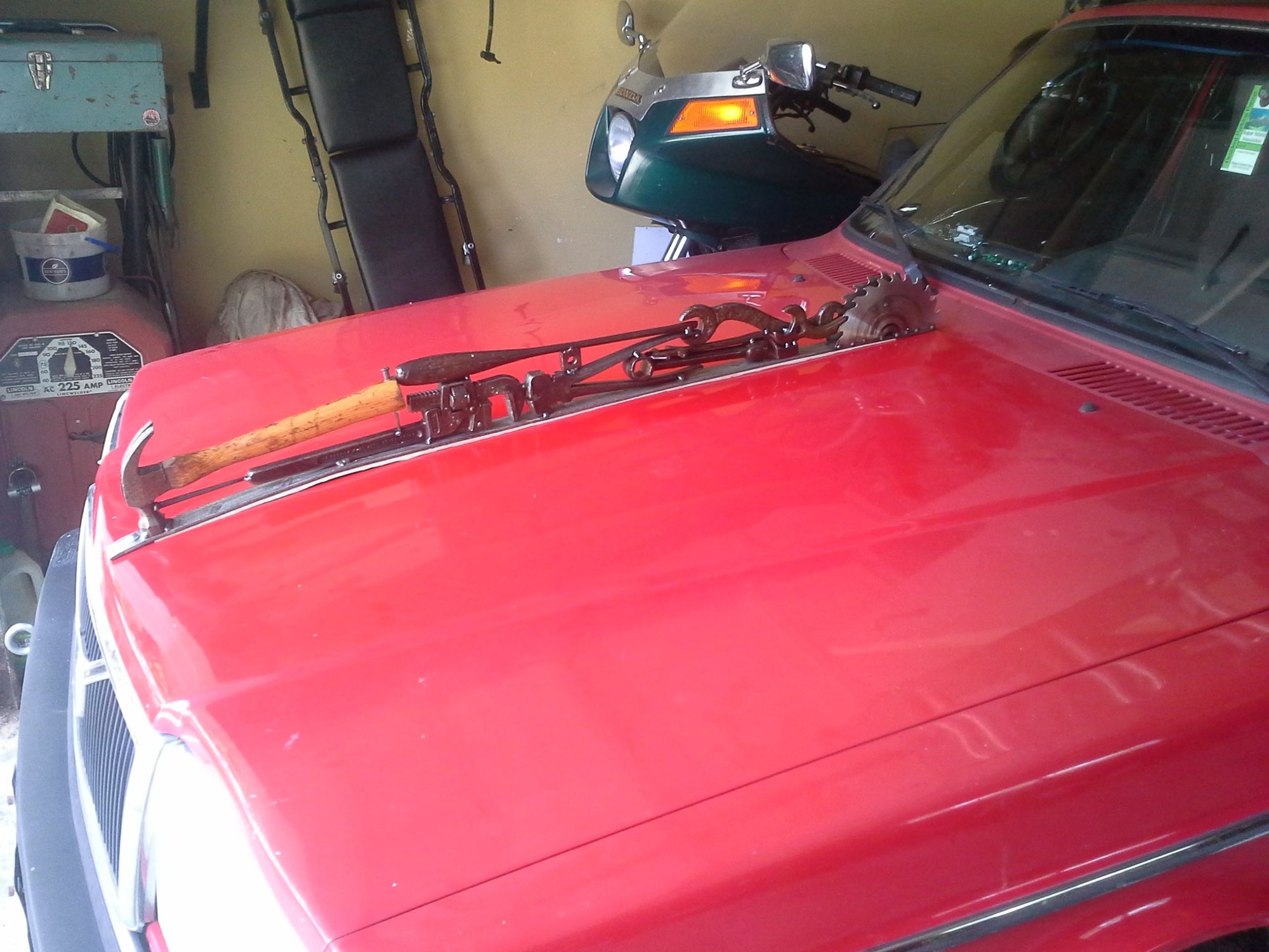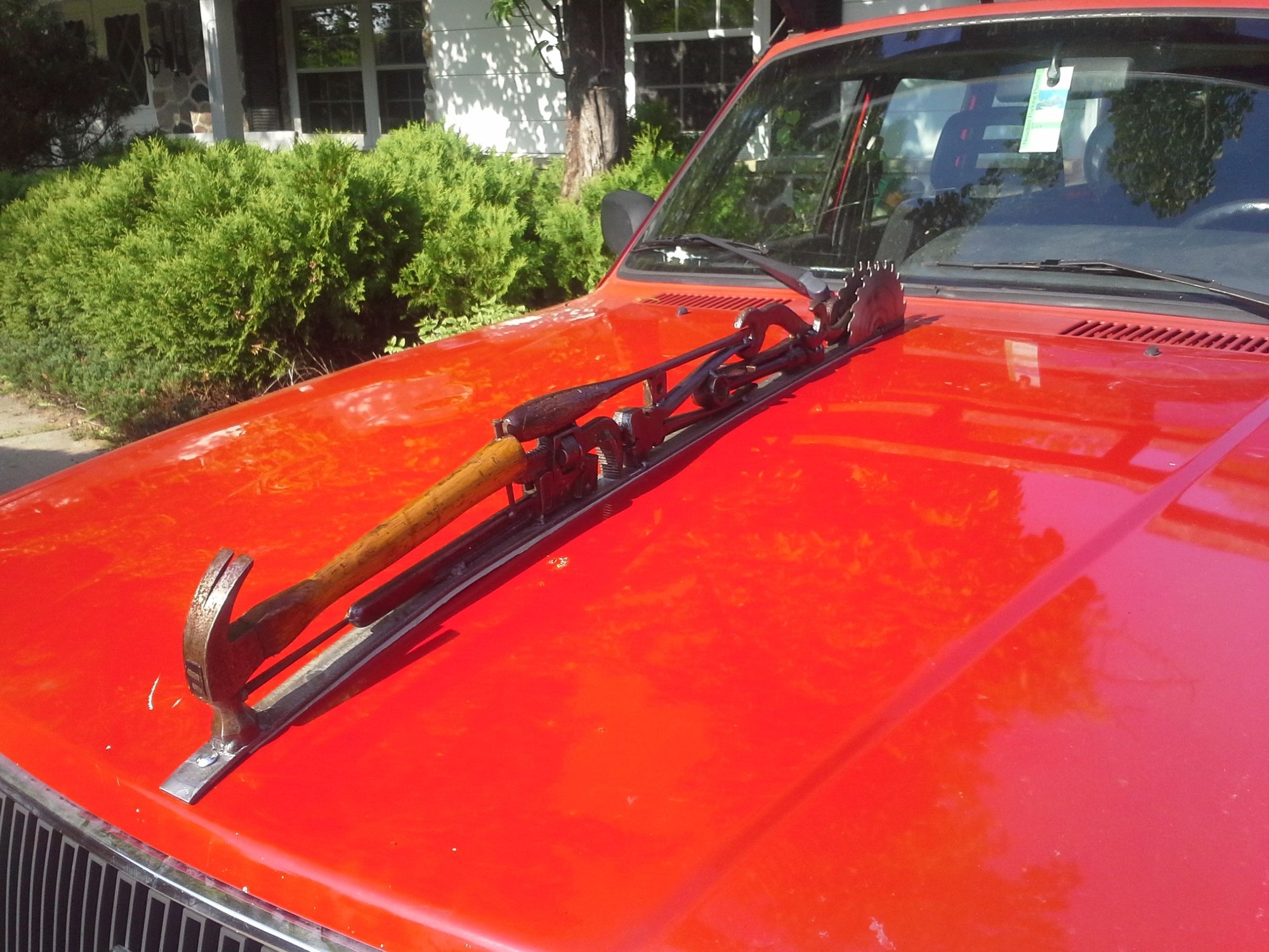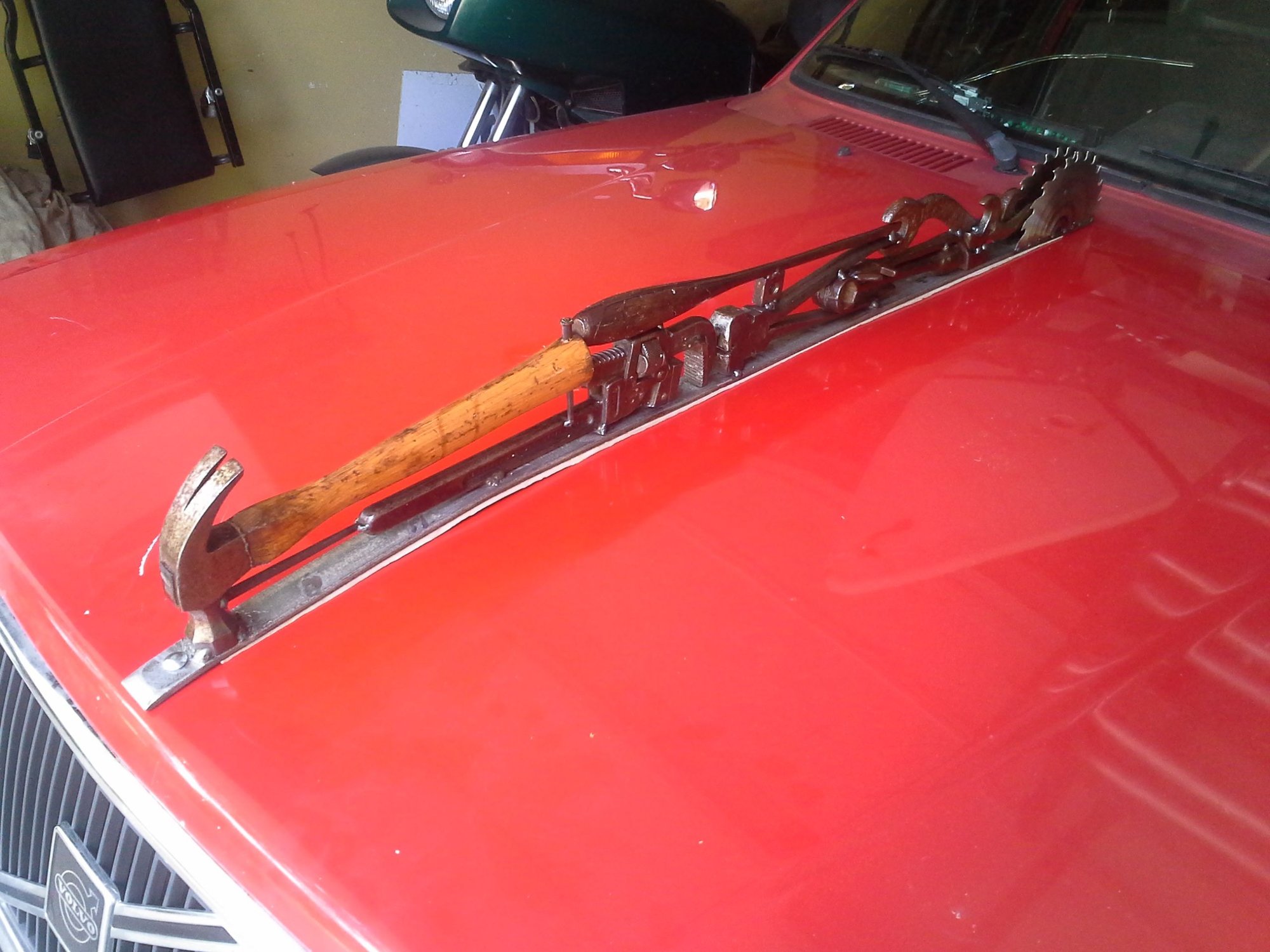 I built this hood ornament from old tools for my 1993 245. It requires two 5/16" holes through the hood and has foam backing underneath to prevent scratching the hood. My hood springs are strong enough to hold up the hood and the hood ornament (your results may vary depending on your springs). I can't count the number of times people have complimented this hood ornament and taken photos of it at stoplights, in parking lots, etc. It makes your 240 (which is already a head turner) into an even more of a head turner.