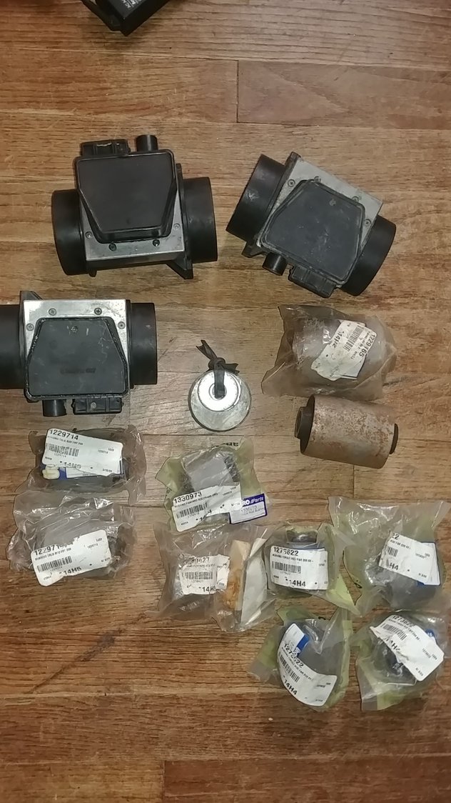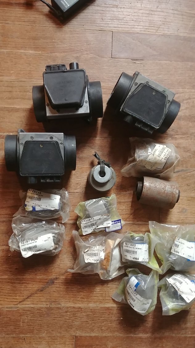 Parts for a 1986 245: (3) Bosch air mass meters, various OEM rubber bushings, 1 distr