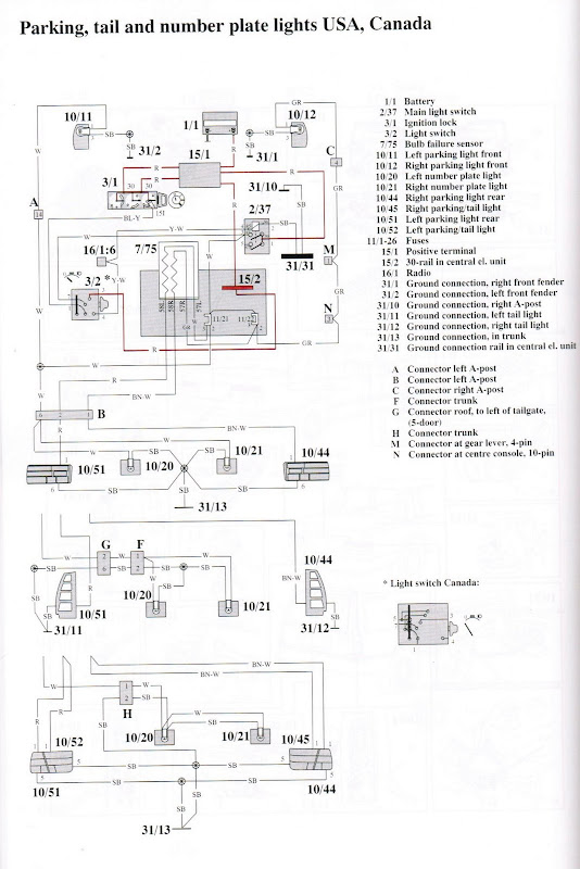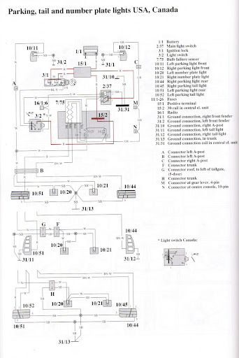 so, the red shows where there is power when the light switch is off and the key is off. when the light switch [3/2] is in the middle position, it connects pins 3 and 7, that brings power to pin 3 on relay [2/37], through fuse 11/21 to the left front parking light and fuse 11/22 to the right front tail light. fuse 11/21 also supplies power on the white wire through connector [B] to both license plate lights, and these two fuses go through the bulb failure module to the rear parking lights on the red (left) and brown-white (right) wires.