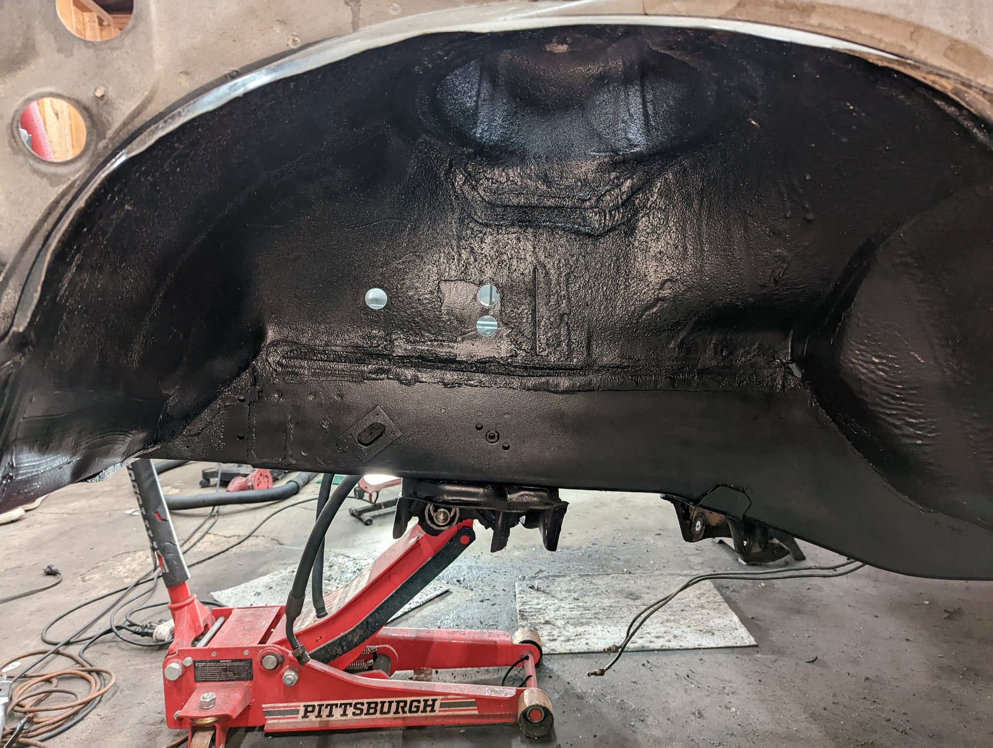 Currently working on the rear suspension; decided to just drop the axle out to address the rest of the road tar undercoating.