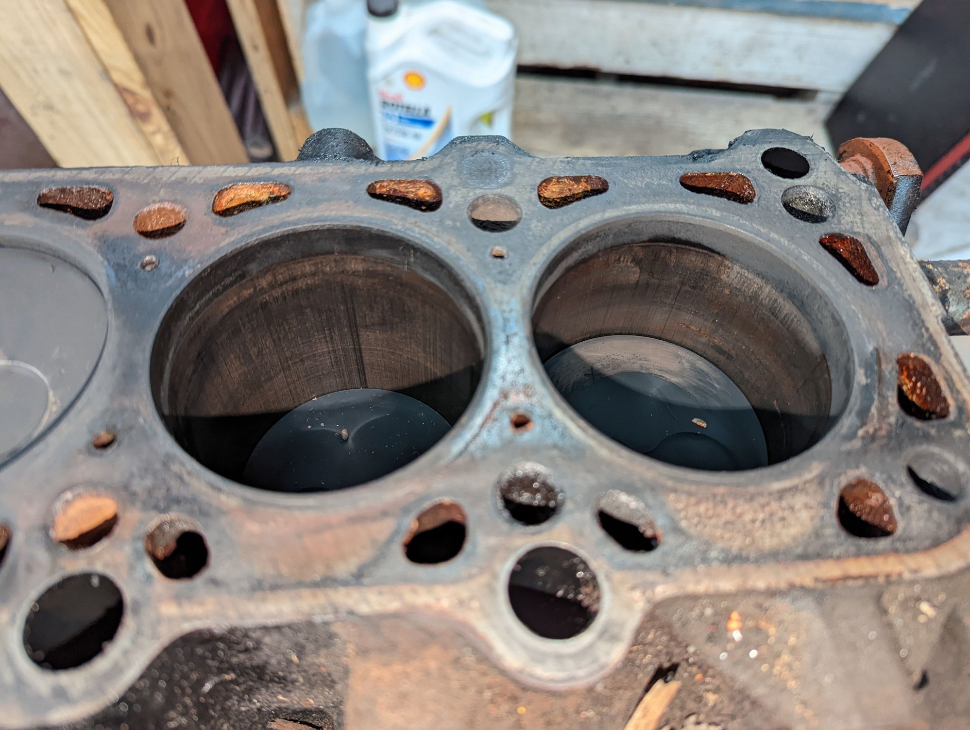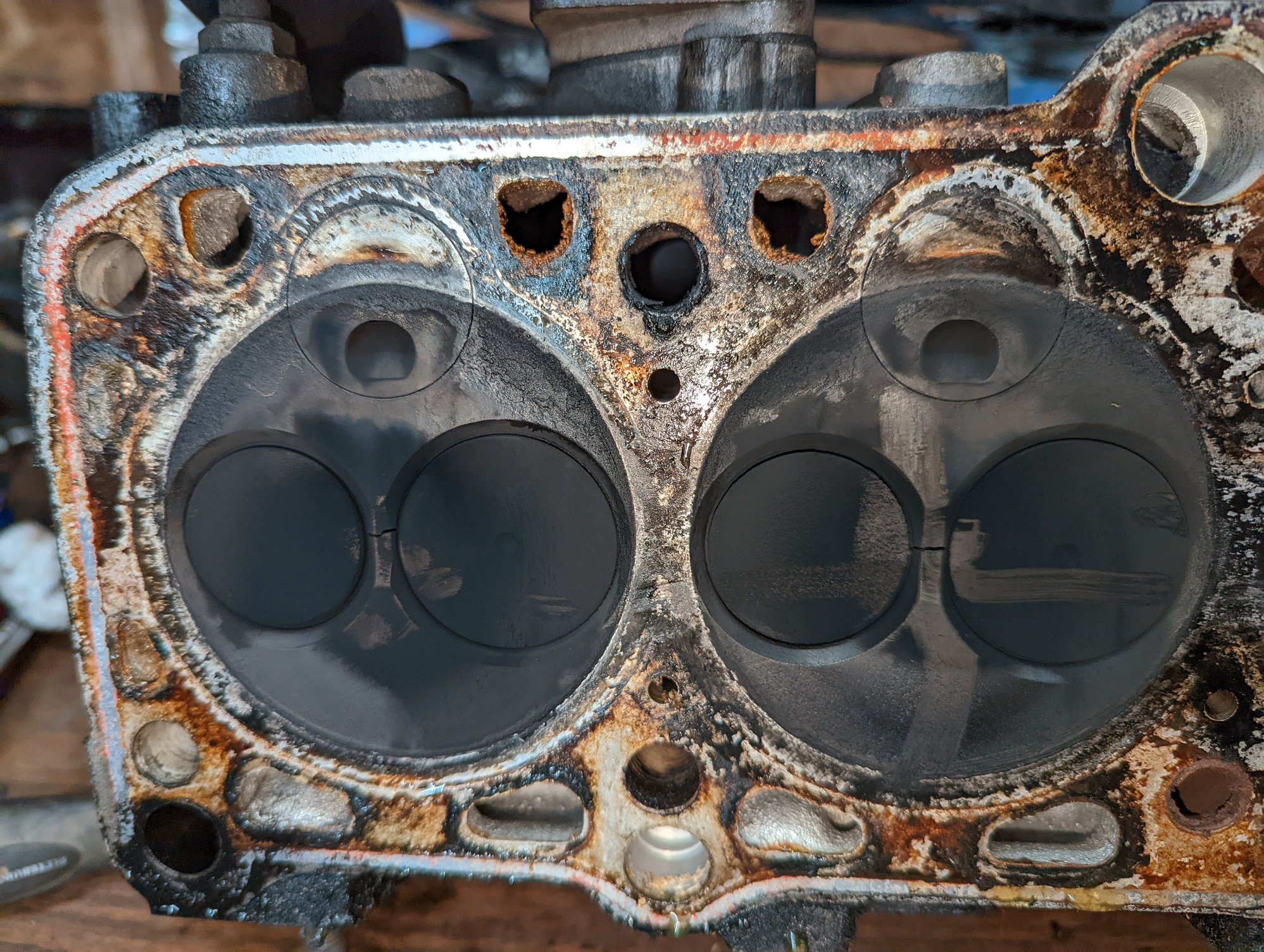 The cracks between the valves (that's normal if you're unfamiliar) are a little wider than I'd like to see, and quite a bit of the #6 piston was in the oil pan, but it wasn't grenaded or warped. Just tired.