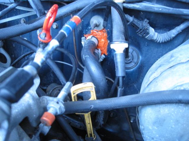Check this picture out. She's pooling radiator fluid on BOTH sides! I was watching it drip, as I removed various panels. Nasty!
