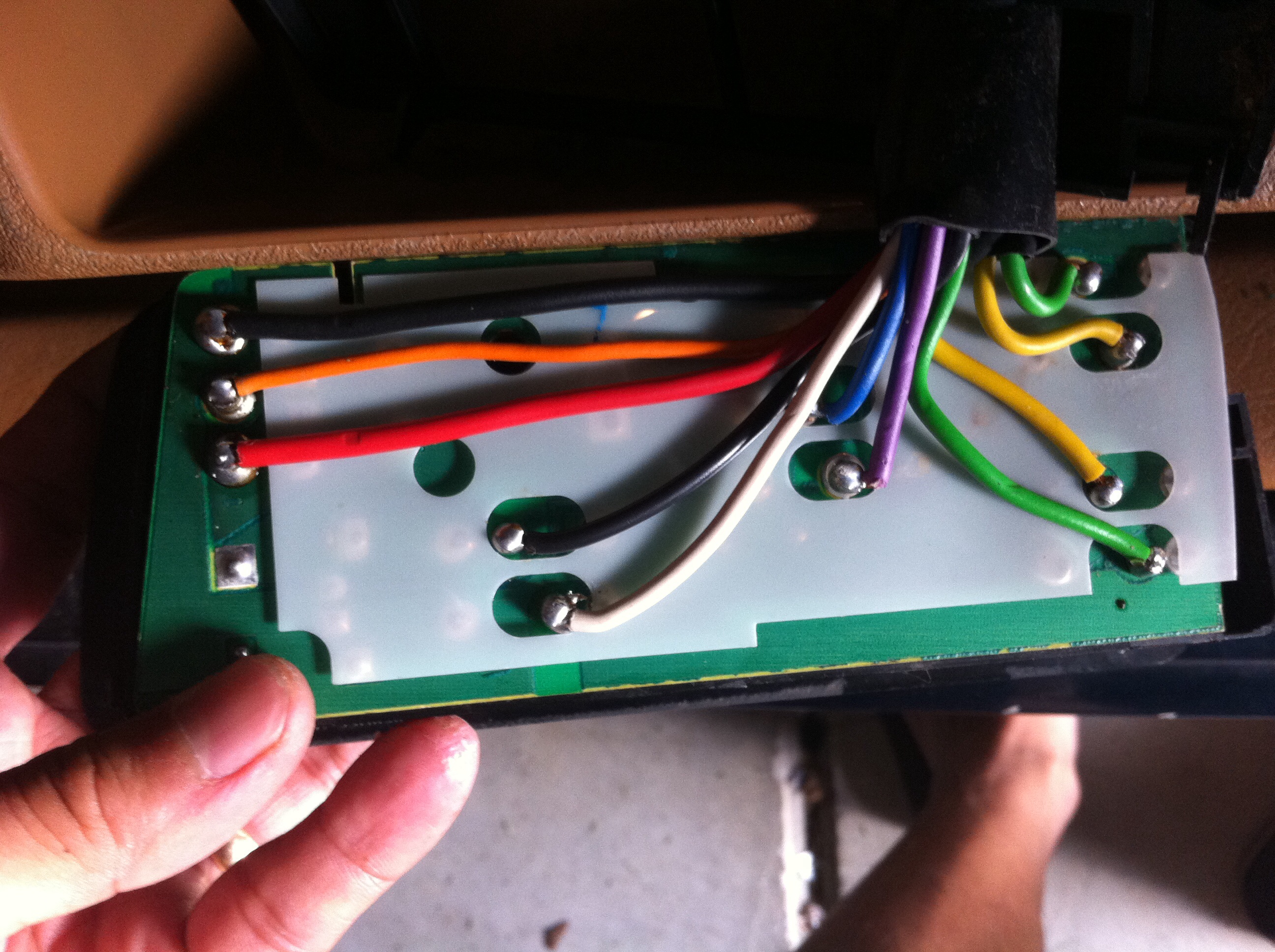 I did better. first, I found a wiring diagram for the non-memory seats. ok, orange is 'control' power for the stop button, red is 'real' power for the motors, black is ground, and the various other wires go to the motors. inside hte switch module there's a relay that the stop button activates, this relay provides power to the other switches to actually power the motors. per extensive prodding with a volt meter it was evident that this relay wasn't working....