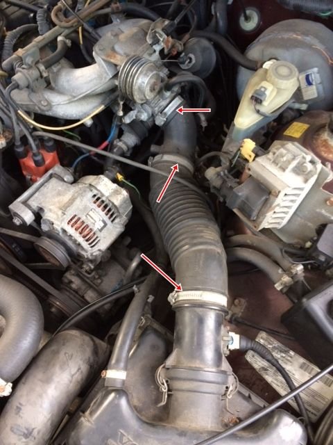 So I rechecked the "paranormal voltage" phenomenon. I'm including a photo with arrows showing where I'm getting voltage readings. Mind you, the meter jumps around, but on these hose clamps, attached to the air intake and not touching metal anywhere, I'm getting readings from .25v to in some cases over 4v. I checked other locations under the hood and get nothing. Any ideas? This seems nuts to me, but I'm thinking it could have something to do with my intermittent issue.