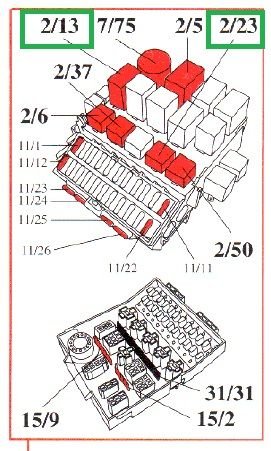 The fuel pump relay for the Turbo cars is in position 2/13. Non turbo cars use a 4 pin square relay to power the fuel pump in position 2/23.