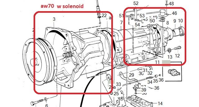 If you have a bw55 automatic, (with the short bellhousing and no solenoid on the left side) - you have a 3 speed transmission. The solenoid for a aw70/71 is pictured below also.