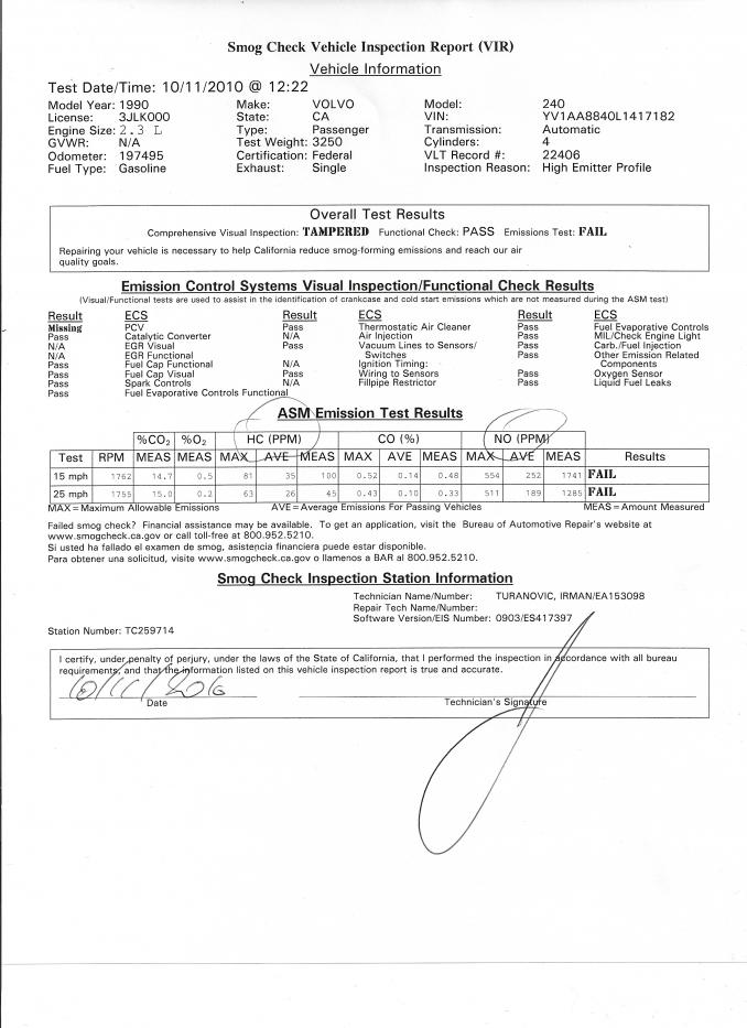 So, I filled up her tank and went to the smog station. I had to wait my turn. About 15 minutes later, she failed the emissions. She has high HC and high NO.