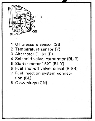 Does anyone have a diagram/picture or drawing they can provide for the Gray Connector at the rear of the engine bay on a 1983 Volvo 245? This is the one with 8 slots, that usually has degraded bare wires leading from it. The diagram I have found on the internet seems to have different colored wiring coming from it.