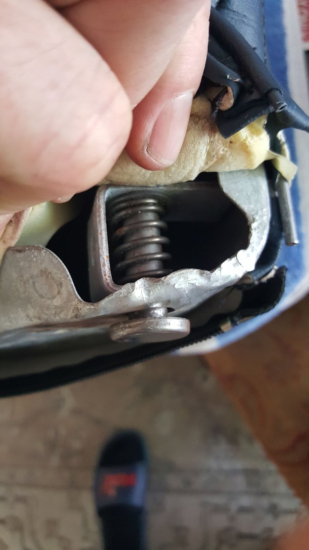 As seen from mounted position (TWSS!) YOU PRI or COUNTER-LEVER THE POST OUT towards the wheel well over the back hooks and pull seat bottom vertically to full release. Good for you? Rinse lather repeat opposite side. Give the other side a full release. Nice! Again pull out vertically. The post head must clear brack hooks nxt pic Its awkward, tight, but much easier then its made out to be. Actually very simple and you dont need to get all Schwarzenegger more like PeeWee Herman. VOILA! PIèce de ré·sis·tance!! I'm assuming that's the easy part of the 93 Wagon rear seat latch& cable/wire repair (Modification with bike break cable) Next on, My wife showed me. Oops