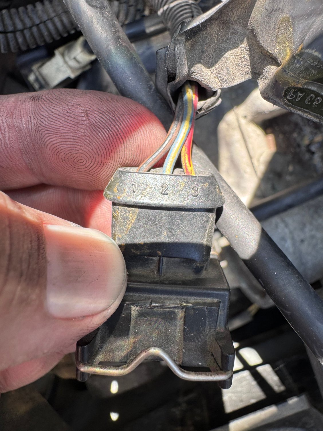 I had zero problems before bumping connector, and since It tests very close to expected 5-10 ohms, I assume wiring bad. Which is ground on harness? grey/green trace? Should I be getting 12v on the yellow/blue trace? I'm also getting2 v on the run (while running).