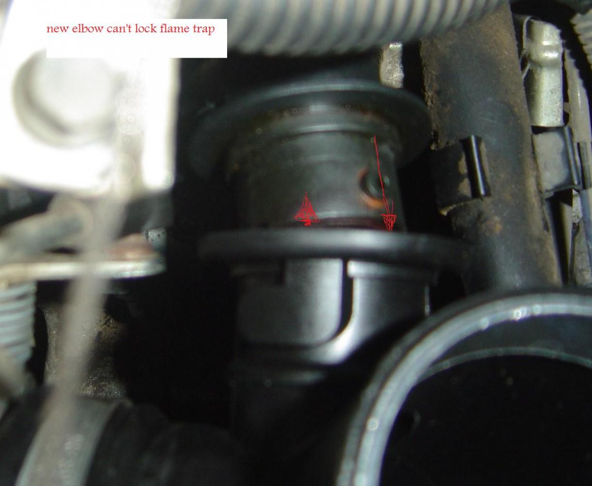It never ends, now got new problem. New air intake elbow that came with air intake hose is different from old one. Actually flame trap connector is flipped 90° and can't lock. I am afraid if I try to turn connector it is going to break.