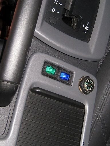 Got your console dismantled? So you might want to consider doing what I did to transform that outdated "toll road coin tray" into something more useful. I used simple rocker switches that light up when switched on (found on ebay). After you cut-out the "tray" in the console...You will need to fashion a flange to seat the switches into the console. I used a piece of black sturdy 1/8" inch plastic that I carefully measured and cut with an Xacto knife so it would just "pop-in" and still remain totally removable. I wired the green switch (finding power from under the console with any "hot" red wire) and a ground to the green switch, to be a simple reminder to me that when switched to the on position, I'm using my "daytime" park lights (which is the 2nd position on the light switch) instead of just burning up my "Factory Swedish daytime driving lights (lightswitch left in the usual off position). Since I live in Southern California I do not need daytime driving lights. So I simply switch my dash light switch to the park light position during day...BUT...I needed a reminder to shut off the main light switch when I parked the car (or it's AAA time, or whoever, to jump a dead battery). and that would be a very bad day...and we don't want that. The other (blue switch) is for aftermarket fog lamps that I added up front (my car came without the factory fog lamp option). The switch tells me that my fog lamps are still lit when I shut off the key. And my "alt power plug" that you see on the 12V factory console receptacle next to the switches is just another of my "usefull adaptations" to the console. It's totally removable to use the receptacle ...I just stuck a small compass into it (instead of the plain black factory cap) so when not in use, it too would have some type of an useful function...other than just a weird black plastic cap-on-the-console.
