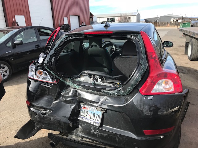 A Honda Element recently rear-ended my C30 while I was at a stop sign. The driver's side of my bumper absorbed most of the impact, and is knocked in pretty far. The rear glass is shattered and the interior back trunk bit is mangled. The airbags did not deploy and the car is drivable. There appears to be some minor damage to the suspension, but I'm not sure whether this necessarily indicates damage to the frame. It's a 2012 C30 with c. 45k miles. Blue Book value c. $12k.