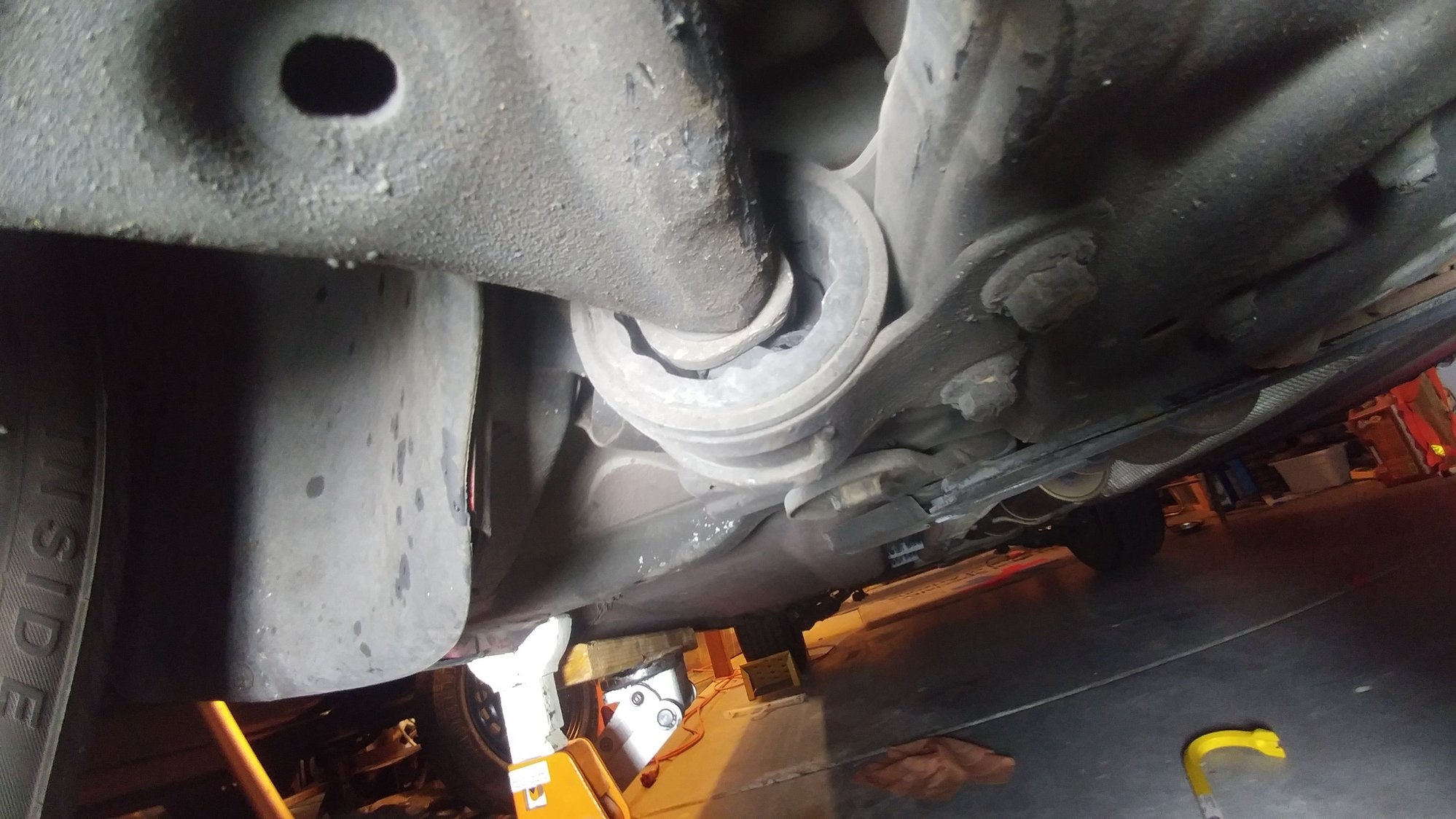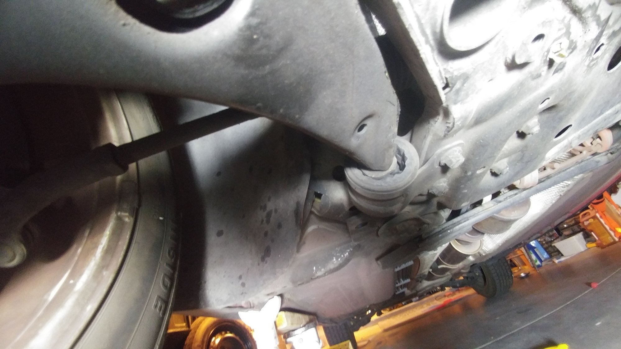 the only part that looks suspect is the rear bushing on the control arm (thanks Habbyguy for that suggestion). On axle stands so no load on the suspension On axle stands so no load on the suspension. I would assume it should be closer to the middle. The rubber in the middle looks a little torn.