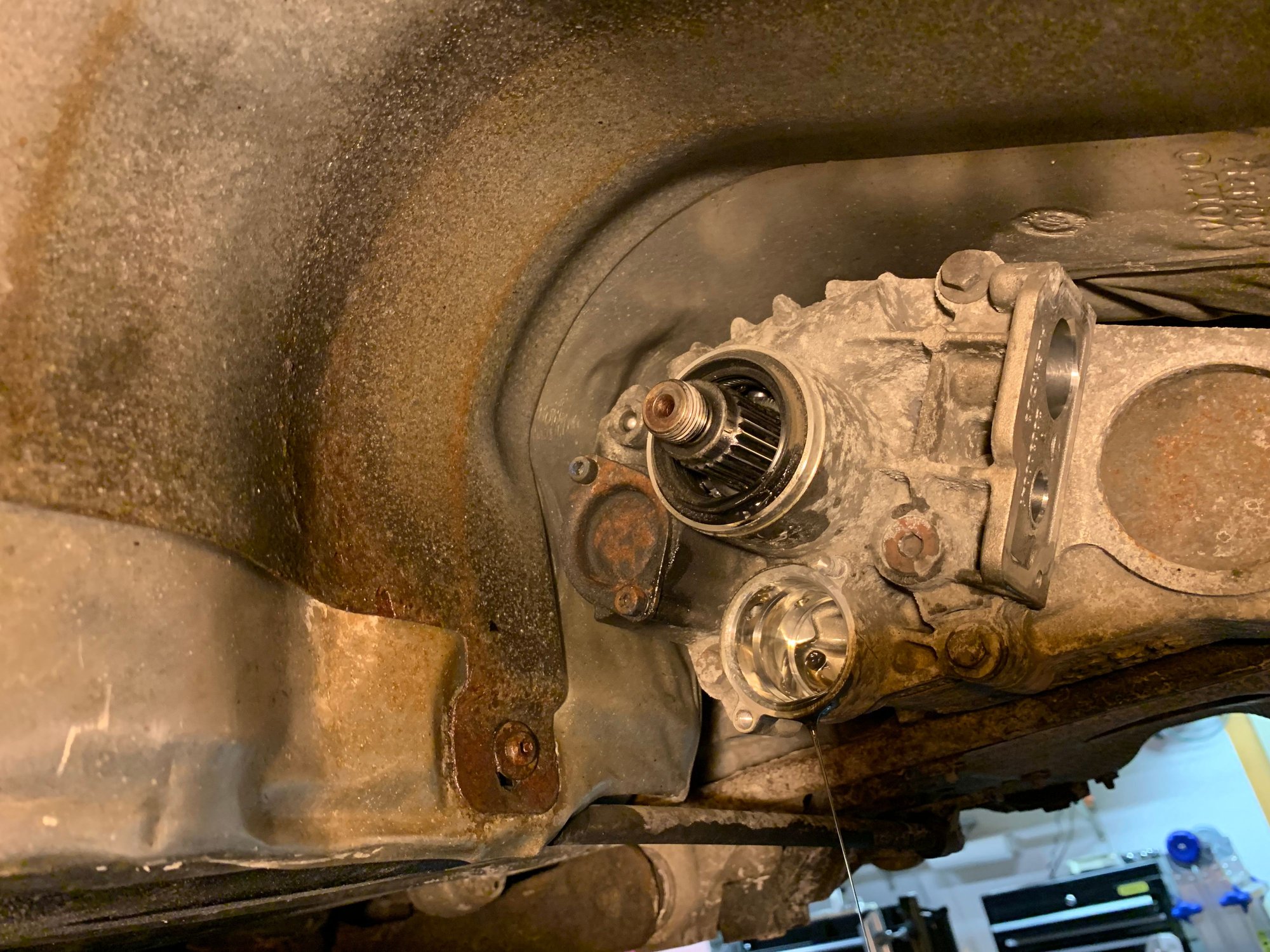 Next challenge was to get the flange off the splines. Again I tried wiggling it with the chain wrench, going back and forth and side to side - similar to how you sometimes can get a steering wheel off the splines of an old car - but that did not work. Again the rubber damper was really working against me in this attempt. So then I decided to make myself a "flange puller". I had some steel laying around and cut a length of it off with my grinder that would almost fit into the flange where the prop shaft bolts in. Then some more grinder work shaped it and shortened it to fit perfectly in there. Then I center punched it and drilled a couple holes (a little oversized since I didn't know exactly how far apart they needed to be) and did the same for the hole in the center. Then I welded a nut to it directly over the middle hole and threaded a bolt into the nut. I used a couple M8 screws to mount the puller to the flange and then started turning the bolt and low-and-behold the flange popped off. When I pulled the flange completely off a bunch of fluid came out of the hole so I had to put a container under it to let it drip into.