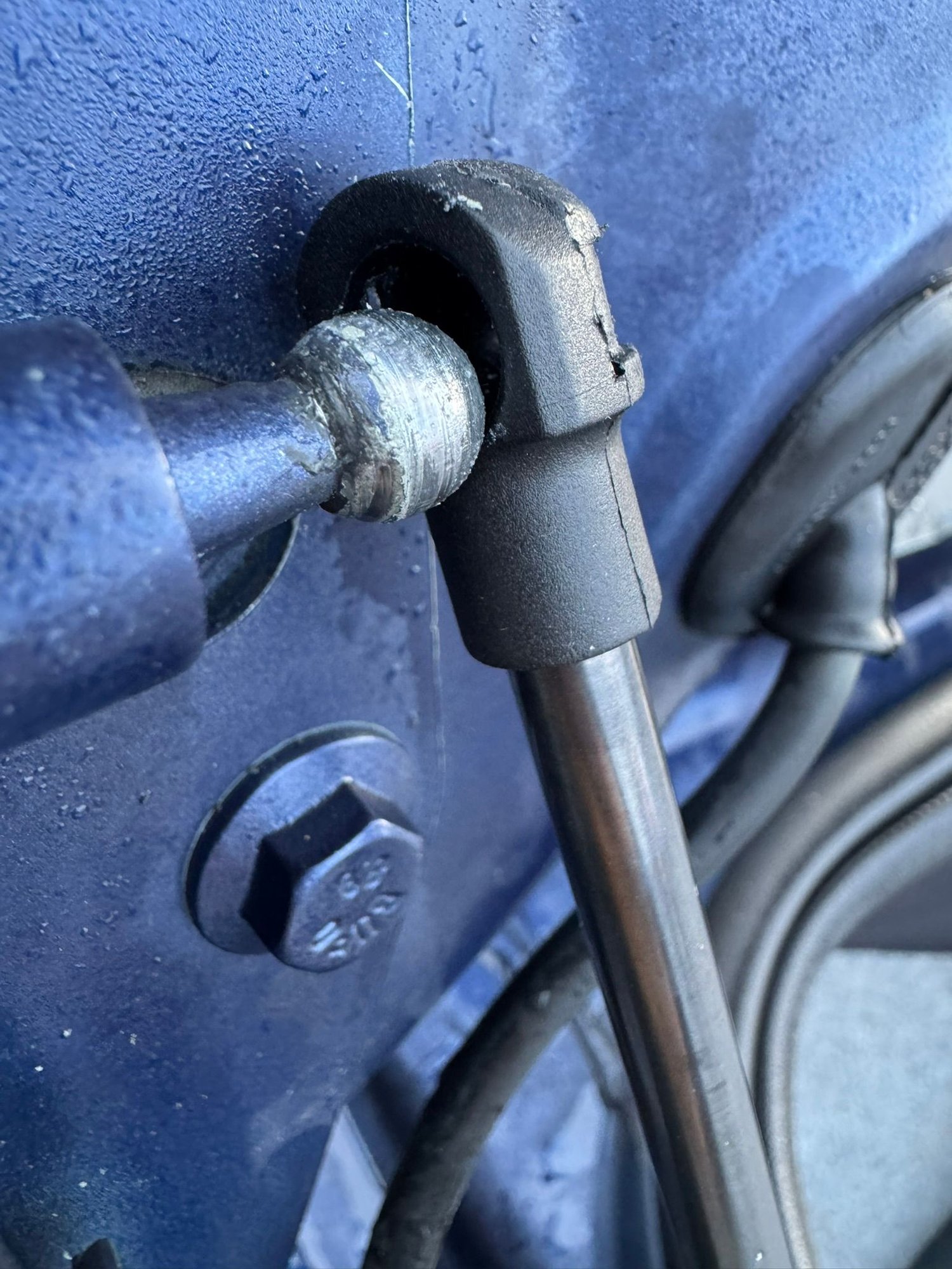 I have purchased a pair of new aftermarket struts for the trunk on my 2004 Volvo S80. They are supposed to be 264mm long, but they appear to be longer than the original ones and I'm not able to get them mounted. Is there a trick to mount them or are they simply too long? The image below shows how they look when they are attached to one of the ball joints while I'm trying to get them over the second joint.