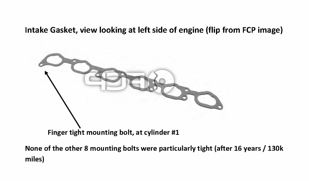 I have found what I think is the cause for my problem and it could be the cause of some others as well. I'll attach an image of the intake gasket, which to my surprise has a very uneven distribution of mounting bolts. In particular, the #1 and #6 cylinders have a single bolt on the opposite ends that are a significant distance for the center of the manifold that has a more even distribution of bolts. I think this issue with the end cylinders was compounded in my case by a gasket that collapsed a bit over the years and possibly a lack of attention during the original build process. I would note that I'm an original owner and I know that this part of the car has never been previously apart. Without removing the injector trim cover (it does just pop off) and some serious inspection, you can't even see the intake manifold bolts. In my case, ALL but one of the manifold mounting bolts were just barely tight, the exception was the #1 bolt which to my surprise I could simply remove with my fingers.