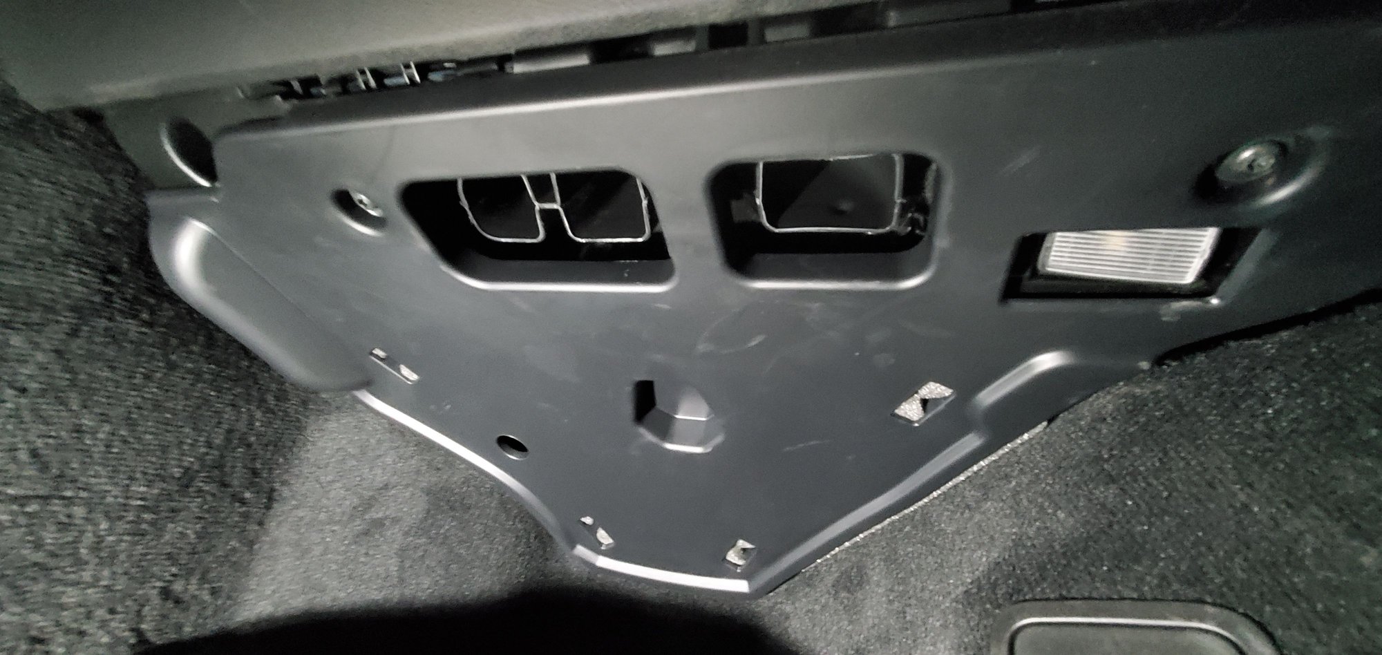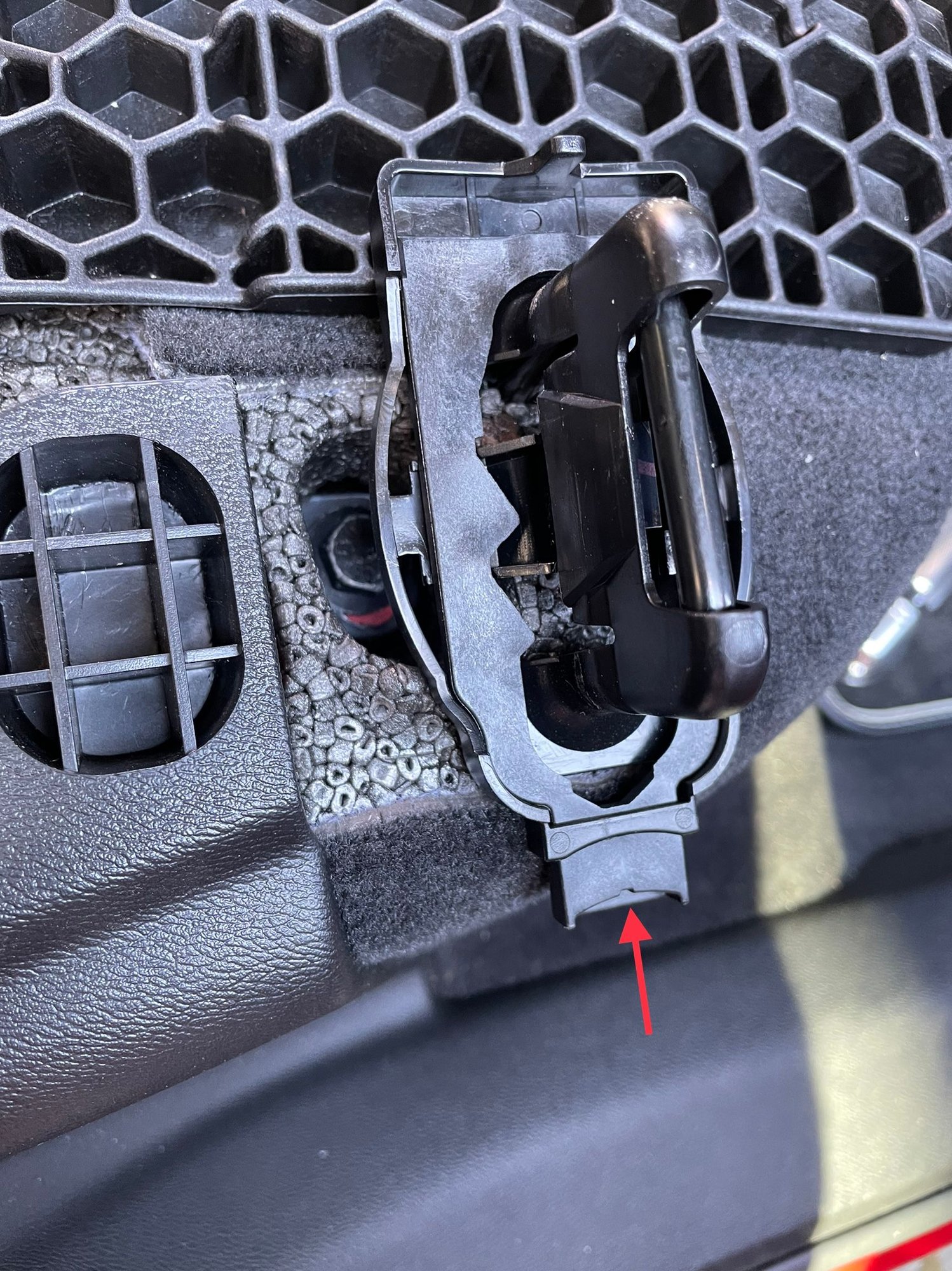 The above, for reference, shows where the clips are behind the trim. Refer to the rounded-rectangular slots the clips mate with in the rear hatch, below.