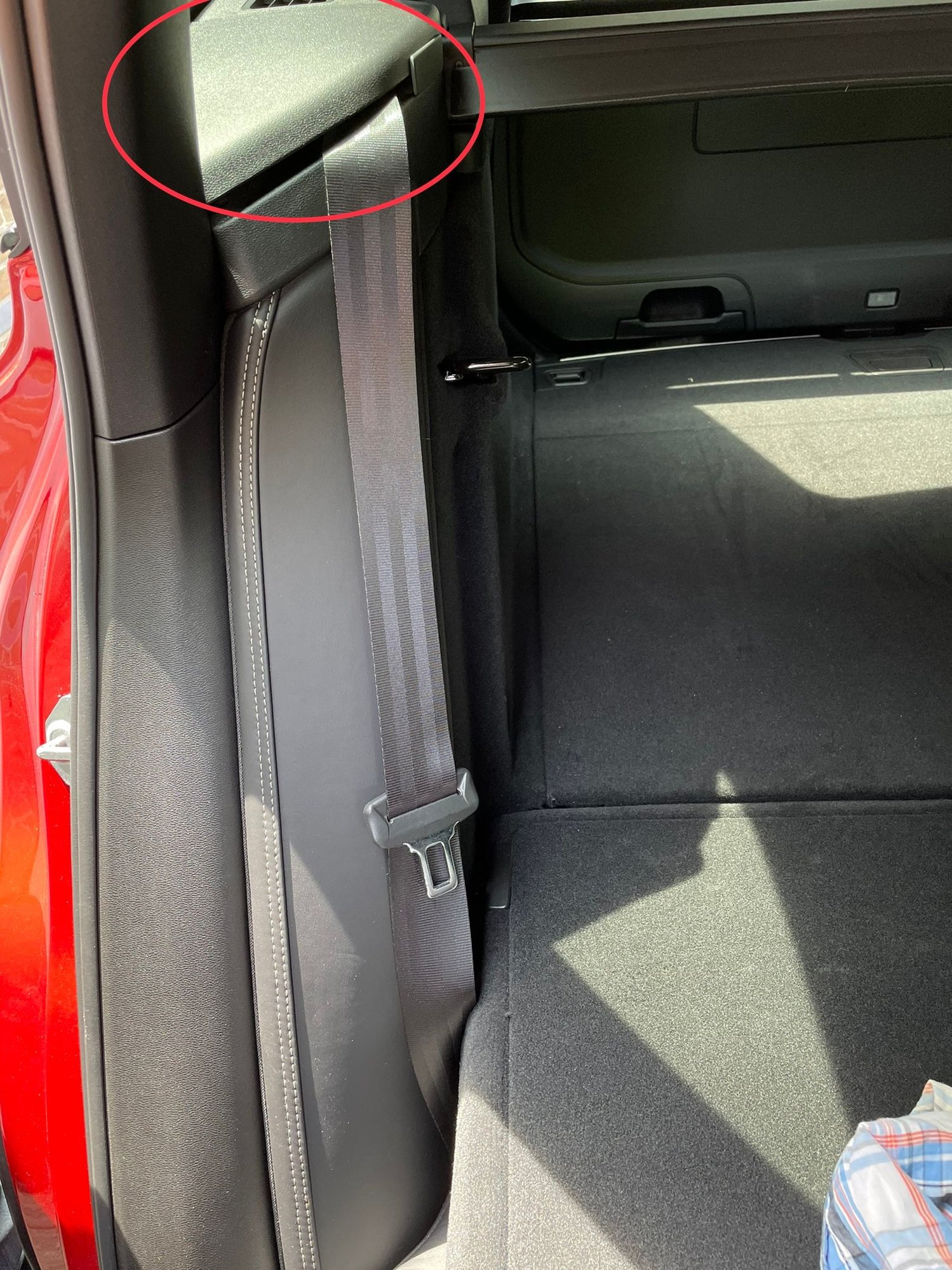 The rear-seat trim removal starts by removing the cover on top of the seatbelt which has 4 clips: