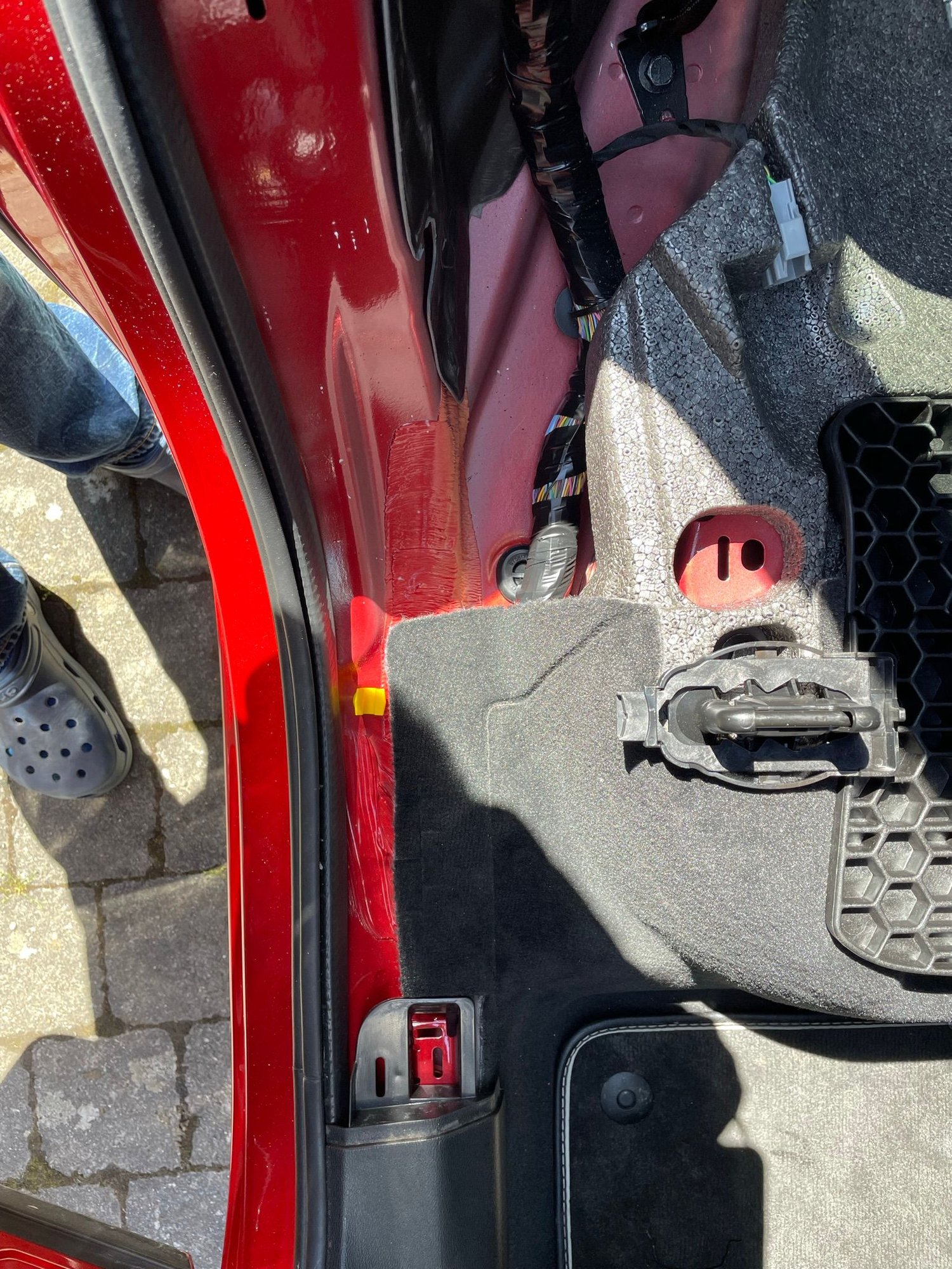 With thanks to the explanations of Frank, I would like to expand the explanations regarding the unclipping of the (right-side) rear door sills and back trim. As Frank mentions, the trim at the foot of the B-pillar does not need to be removed if one uses a fish to pull the cable through.
