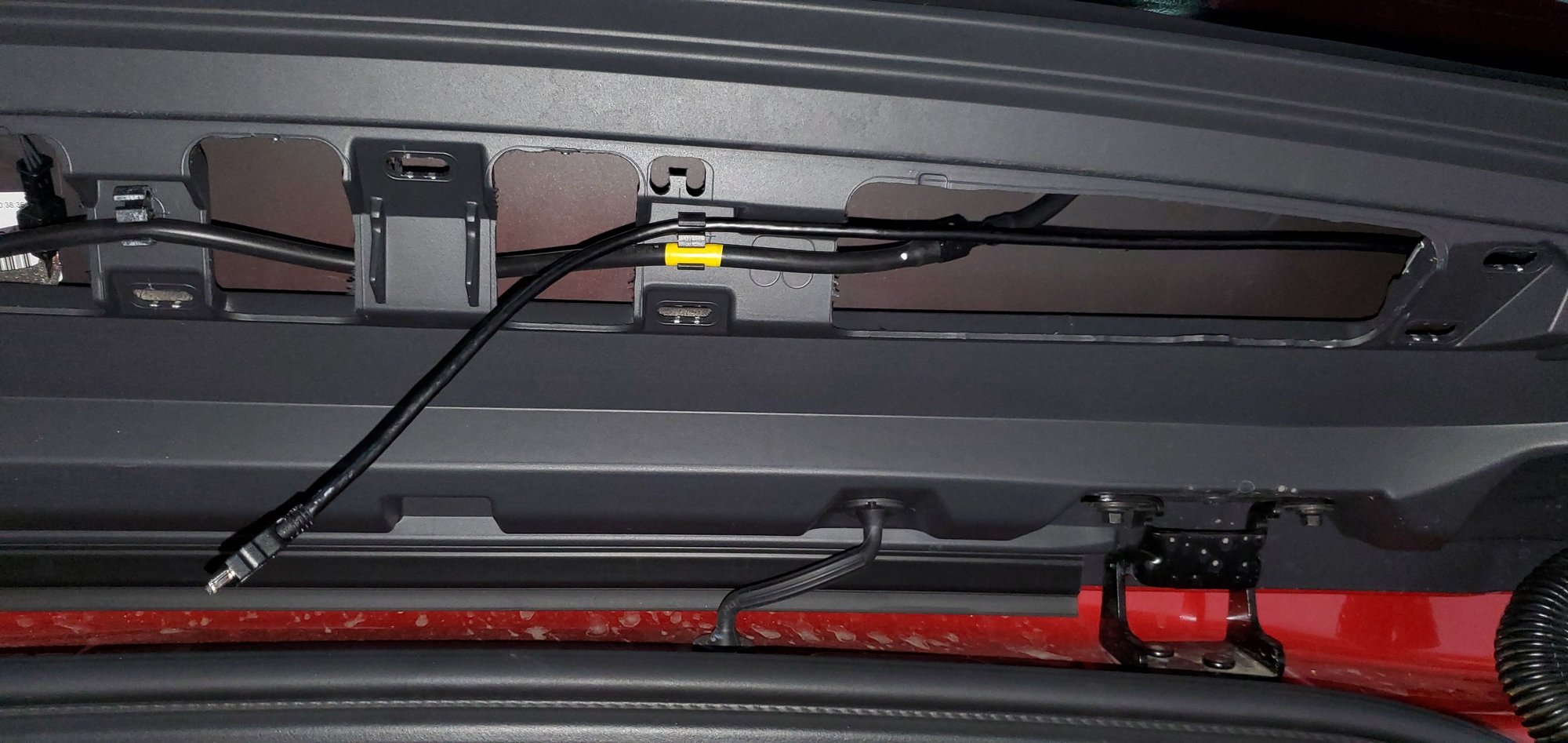 11. The rubber boot between the hatch door and the vehicle body simple pops off each end when a trim tool or other thin lever is used. Be careful of the paint. With both ends of the rubber boot exposed the camera cable may be fished through.