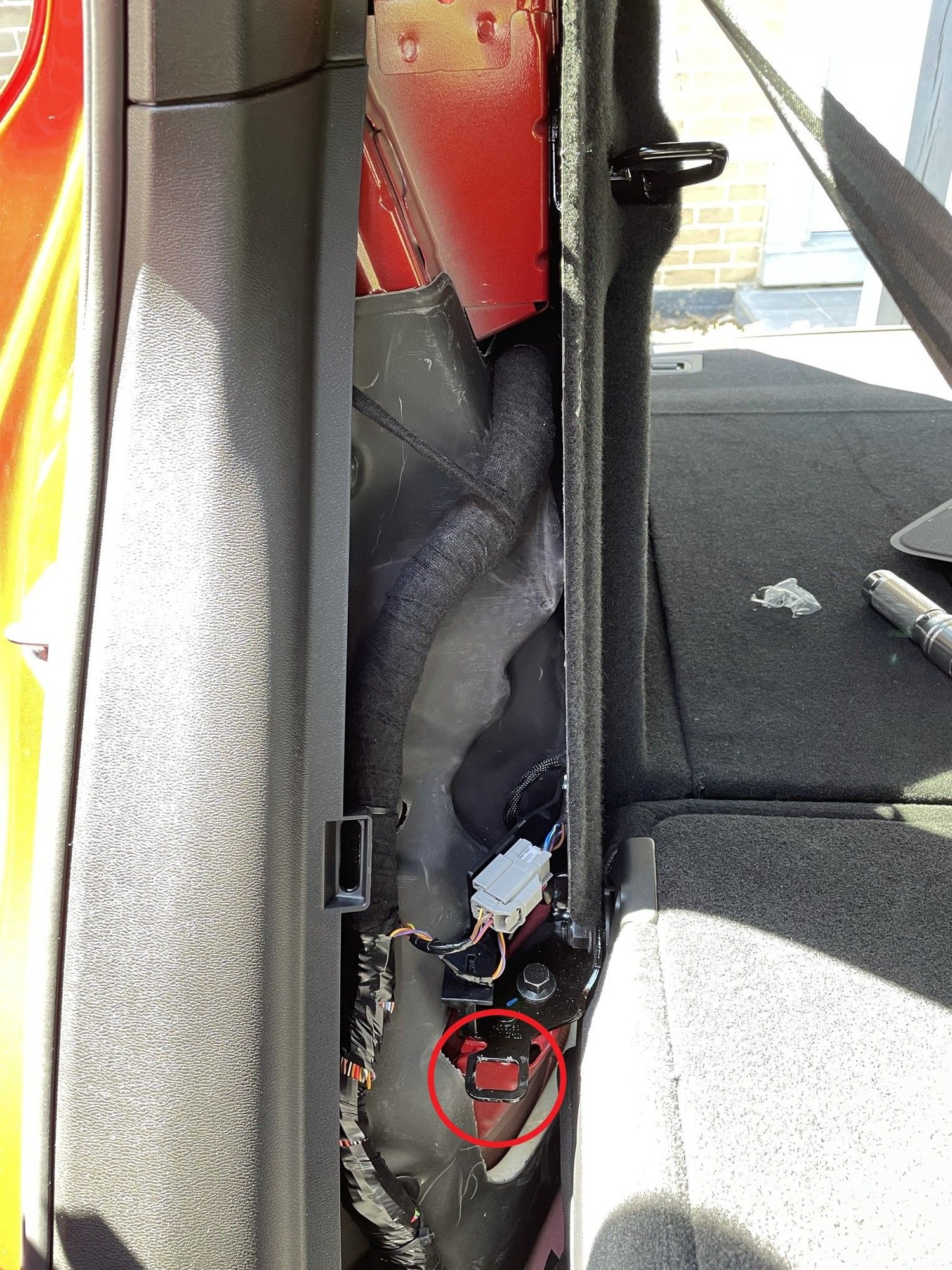 10. The lining and trim to the right-side of the trunk unclips and allows a longer fish to be pushed through to the edge of the rear seat. Use that to pull the cable through into the trunk, and then up behind the C-pillar trim.