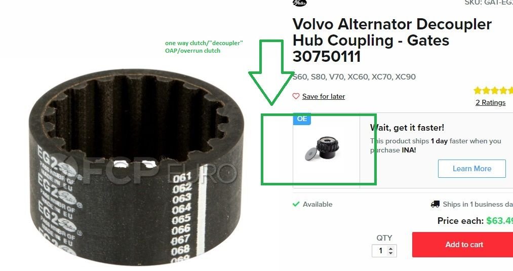 When the one way clutch/decoupler/OAP/overrun clutch goes bad - they usually seize. Then when the engine slow down quickly, the mass of the alternator spinning pulls the drive gear loose (on the READ side) and the alternator stops being driven, it no longer spins and the battery goes dead while driving.