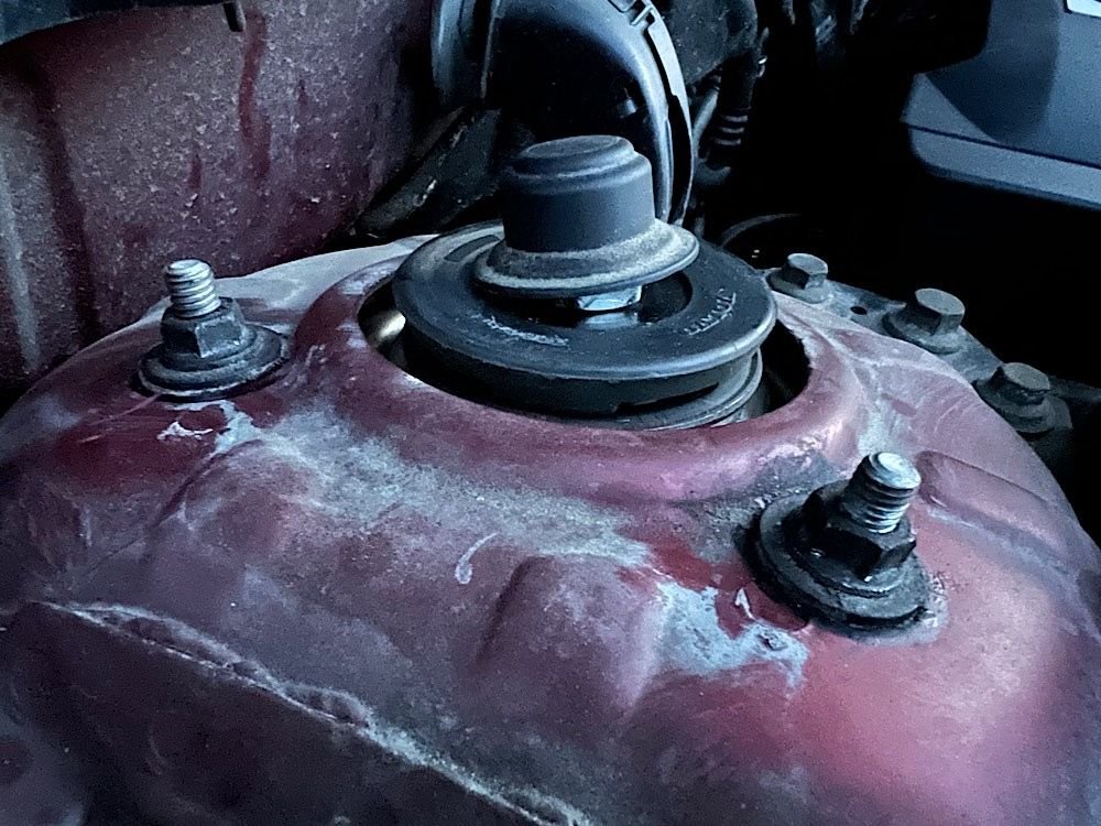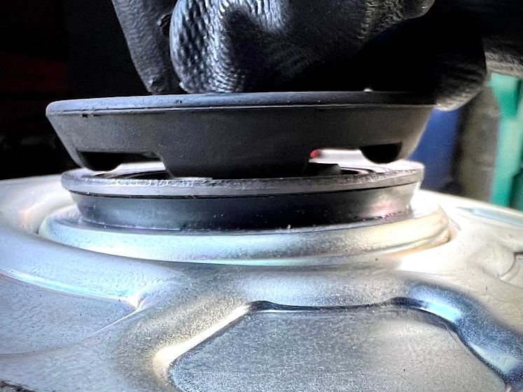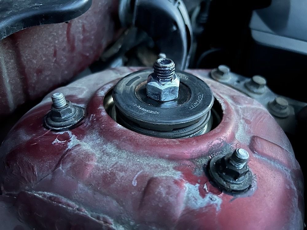 One thing I discovered upon re-assembly; the “+” nut which holds the top mount wouldn’t go down far enough, so the top nut and spacer wouldn’t tighten all the way once the bearing was in place. Both nuts were completely bottomed-out and still left about 1/8” gap, so I ground 1/8” off the metal spacer of the new top mount. It was visibly taller than the one I removed, which appeared to be OEM.